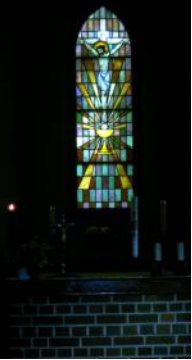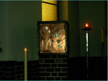 Neben dem Altar steht die Osterkerze. In der Osternacht wurde sie am Osterfeuer entzündet und gesegnet. Der Pfarrer trug sie danach in die dunkle Kirche. Alle Menschen in der Kirche entzündeten ihre eigenen Osterkerzen an dieser Flamme. Auf der Osterkerze sind ein Kreuz, die Jahreszahl und die griechischen Buchstaben Alpa und Omega. das bedeutet: Jesus ist auferstanden, unser Licht. Er ist immer bei uns vom Anfang bis zum Ende der Welt und ganz besonders in diesem Jahr.Am Ambo (Lesepult) findet der Teil der Messe statt, den man Wortgottesdienst nennt. Es werden die Lesungen und das Evangelium vorgetragen und die Fürbitten gesprochen.Hinter dem Altarbefindet sich der Tabernakel und daneben das Ewige Licht. das Wort Tabernakel kommt aus dem lateinischen und bedeutet: Zelt. Bevor der Tempel in Jerusalem gebaut wurde, befand sich die Bundeslade mit den 10 Geboten, dem größten Heiligtum der Israeliten, in einem zelt, zu dem nur der Hohepriester Zugang hatte.In der Messfeier der katholischen Kirche werden die Hostien durch die Worte des Priesters: ,,Das ist mein Leib`` zum Leib Christi. Die so geweihten Hostien werden im Tabernakel aufbewahrt. So ist der Tabernakel das Allerheiligste in der Kirche. Deshalb erweist man hier Gott eine besondere Ehrerbietung und macht eine Kniebeuge zum Tabernakel.Das Ewige Licht brennt als Hinweis dafür, daß im Tabernakel geweihte Hostien sind. Gott ist hier in besonderer Weise anwesend. Man nennt es Ewiges Licht, weil Gott ewig währt. Über dem Tabernakel hängt ein Kreuz.